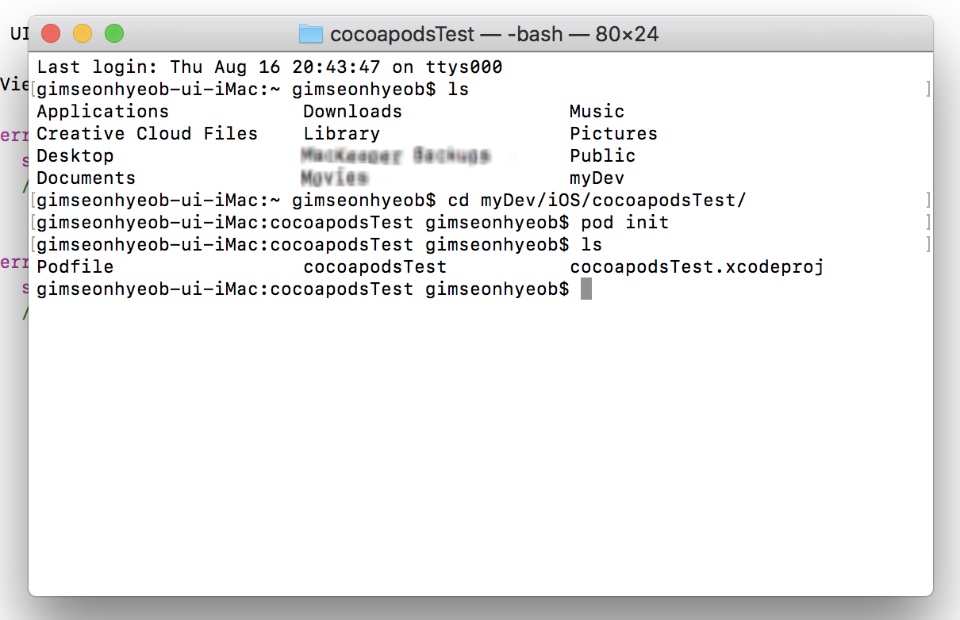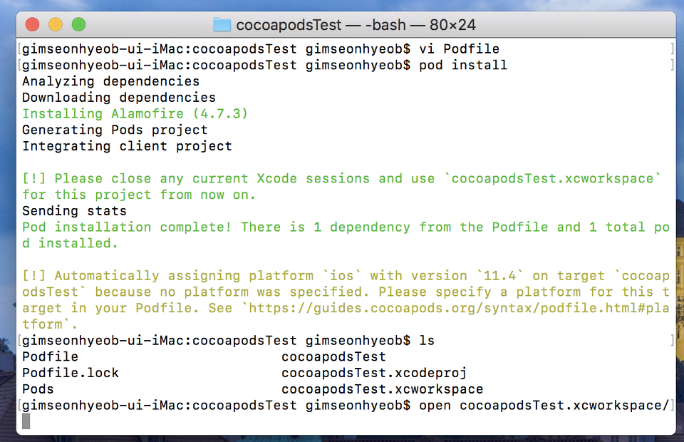 open cocoapodsTest.xcworkspace <- 새로 생긴 파일을 선택