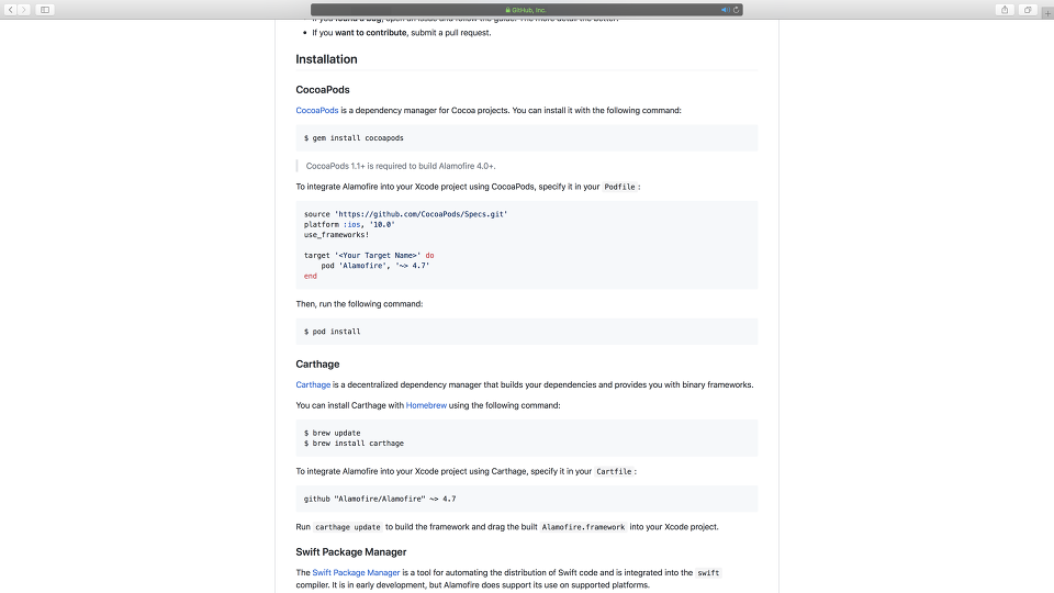 Alamofire 를 찾아보면 설치법이 나옵니다.