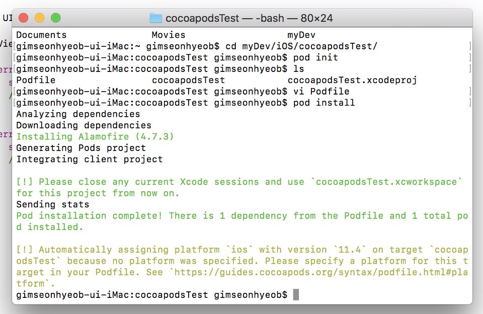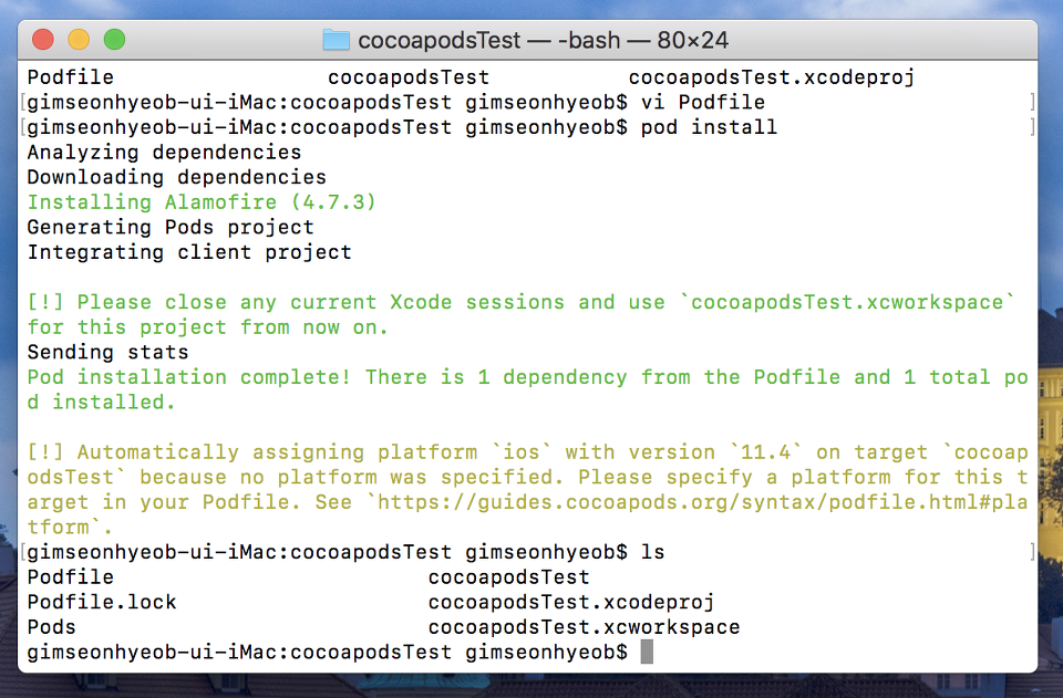 이제 마지막으로 수정된 Podfile 을 이용하여 설치를 하기 위해서