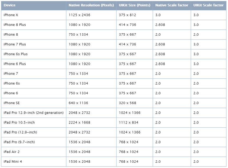위의 웹페이지에 기술된 아이폰 기기별 해상도 및 UIKit size 를 캡처하면 다음과 같습니다.