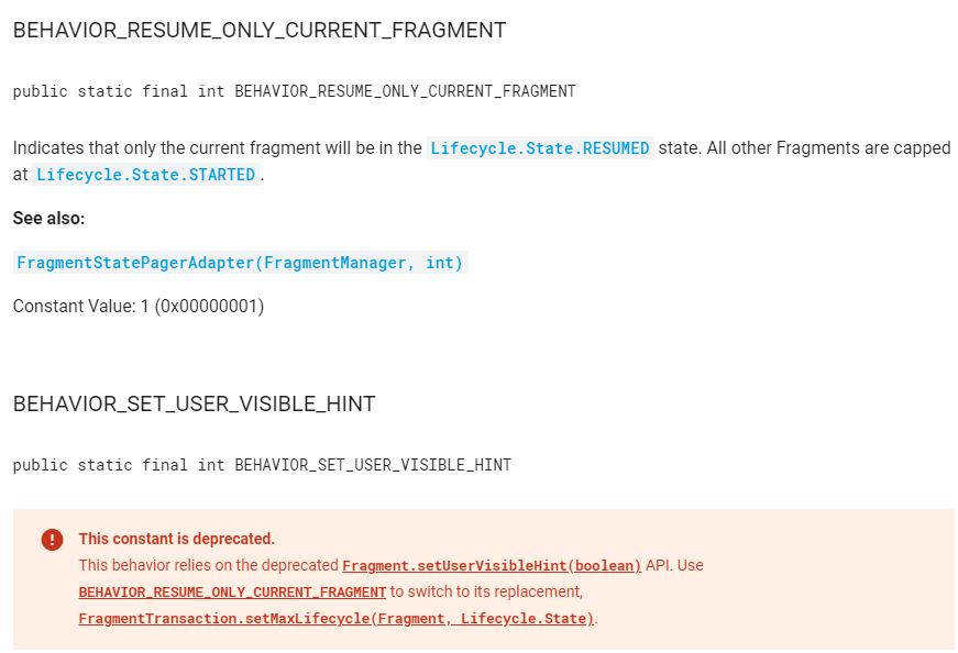FragmentStatePagerAdapter 생성자부분에서 두번째 파라미터가 생겼는데 BEHAVIOR_SET_USER_VISIBLE_HINT,BEHAVIOR_RESUME_ONLY_CURRENT_FRAGMENT 두가지 값으로 나뉘어진다. BEHAVIOR_SET_USER_VISIBLE_HINT 는 deprecated 되었고 BEHAVIOR_RESUME_ONLY_CURRENT_FRAGMENT 를 권장 사용하게 한다.