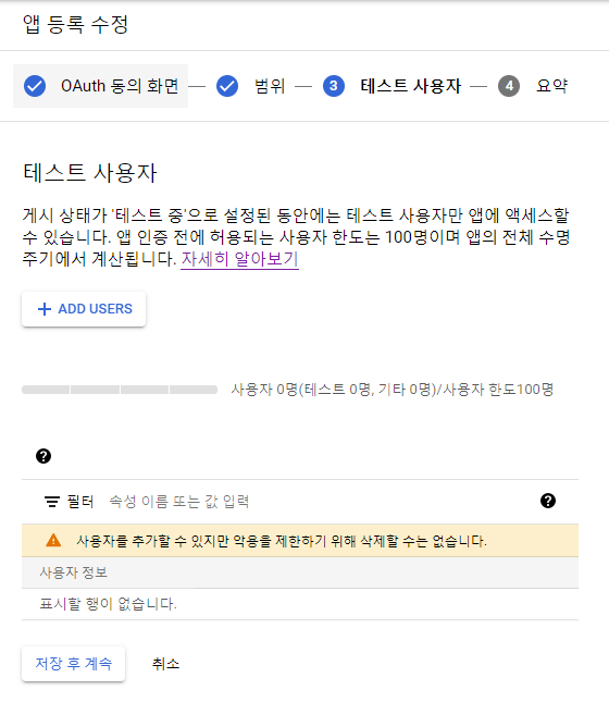 다음으로는 테스트 사용자 추가 입니다. 게시 상태가 "테스트 중"으로 설정된 동안에는 필요하다고 하니... 등록해 줘 보도록 하겠습니다. 테스트 사용자는 e-mail주소 기준으로 진행이되니 사용자@gmail.com으로 등록해 줍니다.