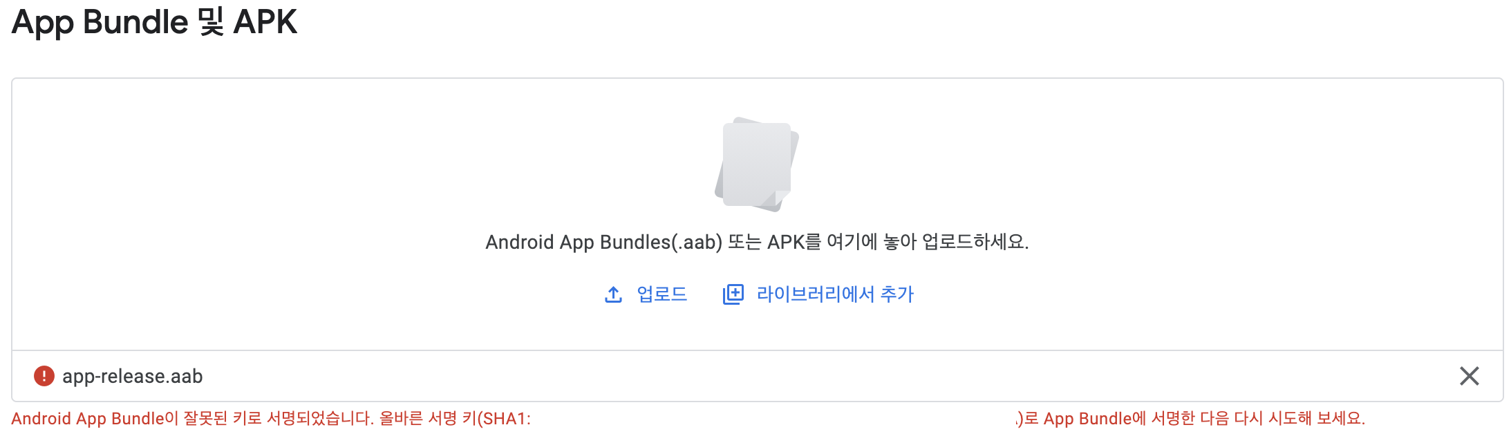 Android App Bundle이 잘못된 키로 서명되었습니다. 올바른 서명 키(SHA1:~)로 App Bundle에 서명한 다음 다시 시도해 보세요. 에러메시지가 떠서 급하게 다시 키스토어를 찾아봤지만ㅠㅠ 이미 미국간 키스토어 파일이 다시 생길리 만무합니다.