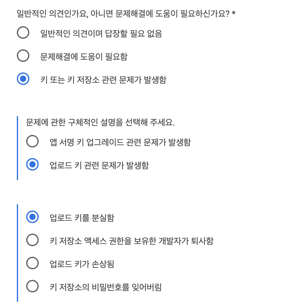 "업로드 키를 분실해서 재설정 하고 싶습니다. upload_certificate.pem 파일을 첨부하니 확인해주세요." 정도로 작성하시면 됩니다.