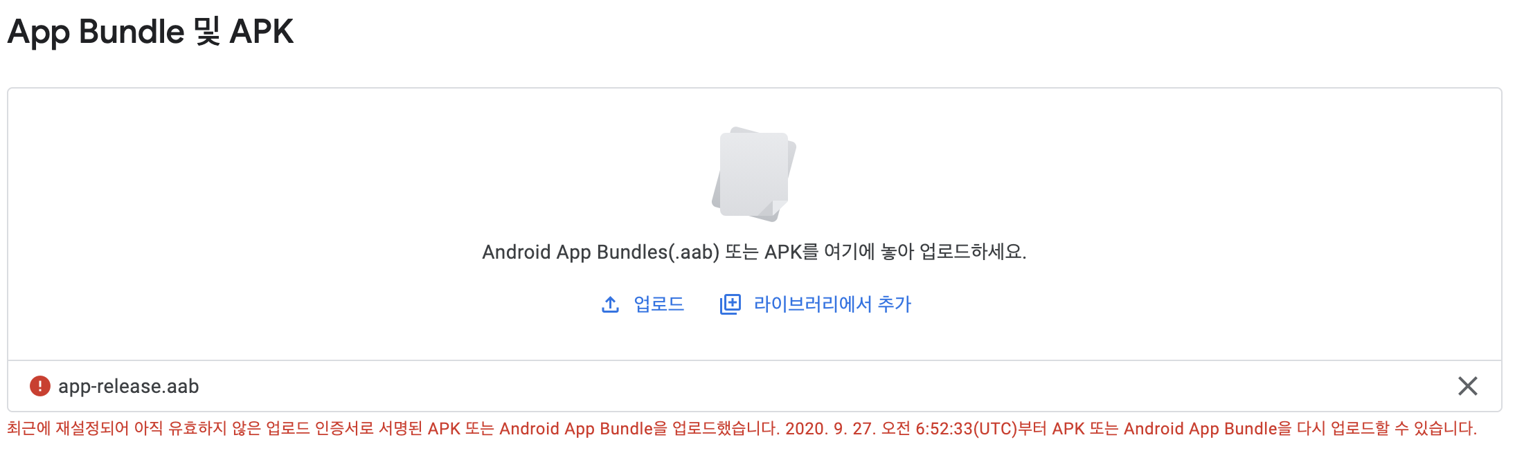 최근에 재설정되어 아직 유효하지 않은 업로드 인증서로 서명된 APK 또는 Android App Bundle을 업로드했습니다. 영국과 한국의 시차가 9시간 이니까 27일 오후 3시 52분에야 업로드 할 수 있었습니다.