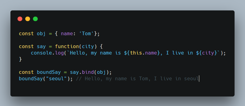 bind함수가 call, apply와 다른 점은 함수를 실행하지 않는다는 점이다. 대신 bound함수를 리턴한다. 이 bound함수(boundSay)는 이제부터 this를 obj로 갖고 있기 때문에 나중에 사용해도 된다. bind에 사용하는 나머지 rest 파라미터는 call과 apply와 동일하다.