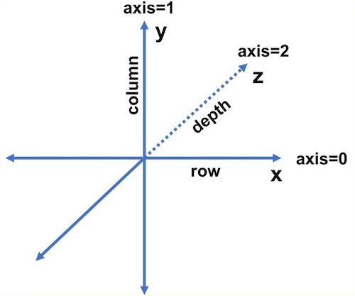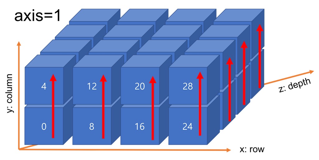 3차원 배열로 만들어진 Tensor의 경우 axis=2를 계산할 때 column은 스칼라값(Depth가 스칼라로 계산됨)이 됩니다. 4차원 이상의 배열로 확장될 경우 이와 같은 방식으로 개념을 적용하고 확장할 수 있습니다.