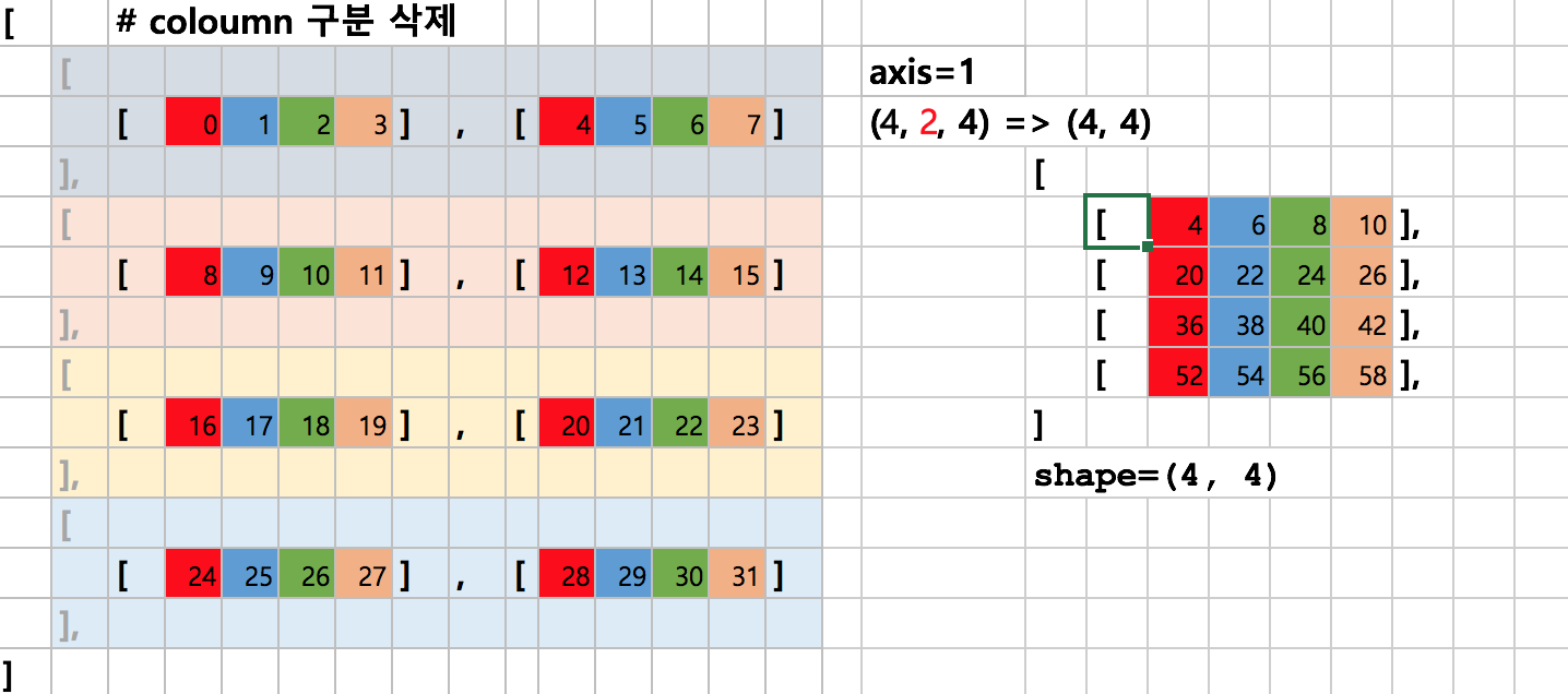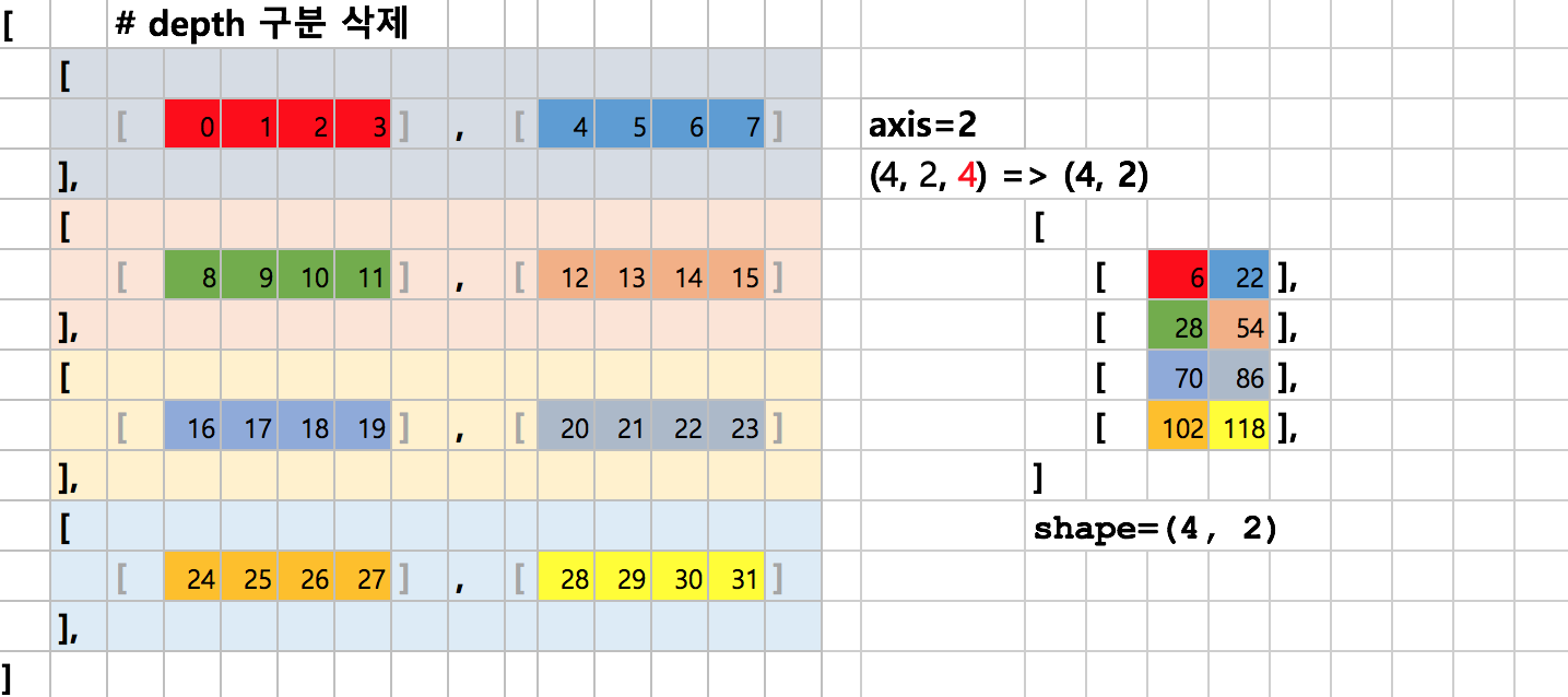 axis=2는 z축을 기준으로 합을 구하는 방식입니다. z축 dpeth 요소를 합치는 연산입니다. shape이 (4, 2, 4)인 데이터를 z축을 기준으로 합산하면 결과 shape은 depth를 제거한 (4, 2)가 반환 됩니다. 각 컬럼의 depth는 1개의 스칼라값으로 변환됩니다.