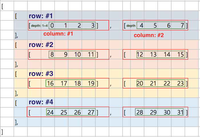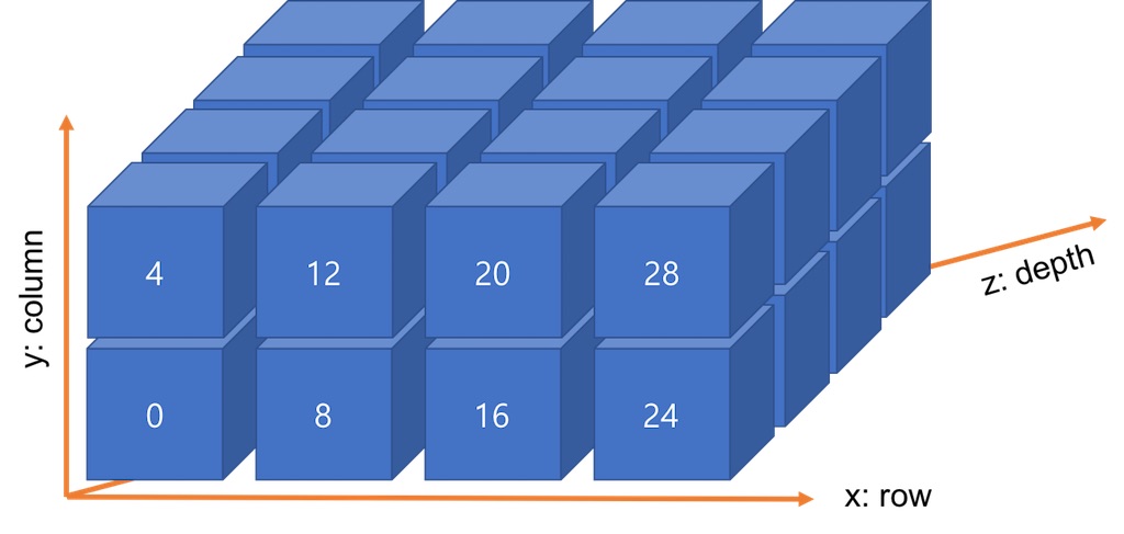 2차원 배열 형태의 행렬(matrix)은 x축의 행과 y축의 컬럼을 갖습니다. 2차원 배열 행렬은 depth가 1이라고 생각할 수 있습니다.1