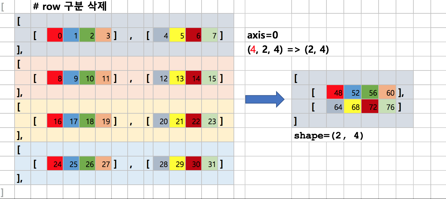 axis=0은 x축을 기준으로 여러 row를 한 개로 합치는 과정입니다.