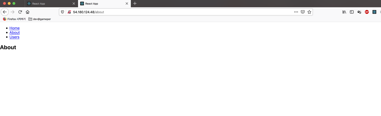 server { listen 80; server_name {nginx server ip 혹은 domain 설정}; access_log /var/log/nginx/demo/access.log; error_log /var/log/nginx/demo/error.log; location / { root /usr/share/nginx/demo/; index index.html index.htm; # try_files 는 최하위 우선순위를 갖는 슈도 location 블럭을 생성한다. # - 특정 uri 로 들어왔는데 매칭되는 것이 없는 경우 index.html 을 보낸다. try_files $uri $uri/ /index.html; } }이제 {domain}/about 으로 접속했을 때 아래처럼 실행 된다면 성공입니다!! (nginx 는 다시 실행시켜 주세요)