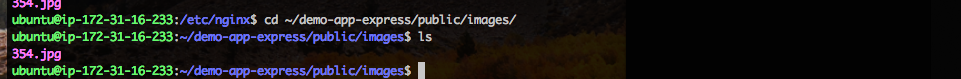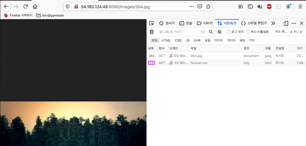 server { listen 8080; server_name {nginx server ip 혹은 domain 설정}; access_log /var/log/nginx/proxy/access.log; error_log /var/log/nginx/proxy/error.log; # 가장 우선순위가 낮다. 마지막에 읽치하지 않을 때 실행 location / { include /etc/nginx/proxy_params; proxy_pass http://127.0.0.1:3000; } # Media 파일들인 경우 캐시를 지정 location ~* \.(?:jpg|jpeg|gif|png|ico|cur|gz|svg|svgz|mp4|ogg|ogv|webm|htc)$ { include /etc/nginx/proxy_params; proxy_pass http://127.0.0.1:3000; # 캐시 존을 설정 (캐시 이름) proxy_cache cache_zone; # 200 302 코드는 20분간 캐싱 proxy_cache_valid 200 302 20m; # 404 에러 코드는 20분간 캐싱 proxy_cache_valid 404 20m; # X-Proxy-Cache 헤더에 HIT, MISS, BYPASS와 같은 캐시 적중 상태정보가 설정 add_header X-Proxy-Cache $upstream_cache_status; # Cache-Control 은 public 으로 설정 add_header Cache-Control "public"; # 클라이언트의 헤더를 무시한다. # - “X-Accel-Expires”, “Expires”, “Cache-Control”, “Set-Cookie”, “Vary” 의 헤더는 캐시에 영향을 줄 수 있는 요소이므로 잘 설정할 것 proxy_ignore_headers X-Accel-Expires Expires Cache-Control; # 만료기간을 1 달로 설정 expires 1M; # access log 를 찍지 않는다. access_log off; } }테스트 이미지를 이용해서 캐시가 잘 되는지 확인해보겠습니다. nodejs 프로젝트의 image 디렉토리인 demo-app-express/public/images 로 이동하시기 바랍니다. 거기서 sample image 를 다운받아 봅니다. 이미지가 잘 받아와졌다면 아래와 같이 354.jpg 이름의 이미지가 받아진 것이 보일 것입니다.