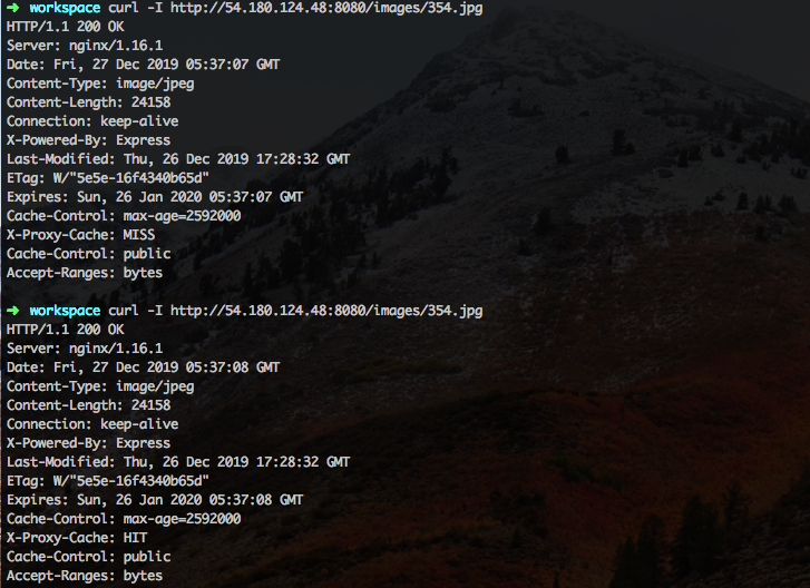 그럼 curl 명령어릁 이용해서 이 이미지를 가져올 때 캐싱이 잘 되는지 확인해보겠습니다. 같은 명령어를 두번 입력해 주도록 합니다.