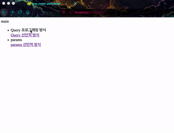 {name: 'Params', params: {name: 'dog', age:4}}<template> <div> main <ul> <li @click="clickList"> Query 프로그래밍 방식 </li> <router-link :to="{name: 'Query', query: {name: 'cat', age: 3}}"> Query 선언적 방식 </router-link> <li @click="clickParams"> params </li> <router-link :to="{name: 'Params', params: {name: 'dog', age:4}}"> params 선언적 방식 </router-link> </ul> </div> </template> <script> export default { name: 'Main', methods: { clickList () { this.$router.push({name: 'Query', query: {name: 'cat', age: 3}}) }, clickParams () { this.$router.push({name: 'Params', params: {name: 'dog', age:4}}) } } } </script>3. 라우터