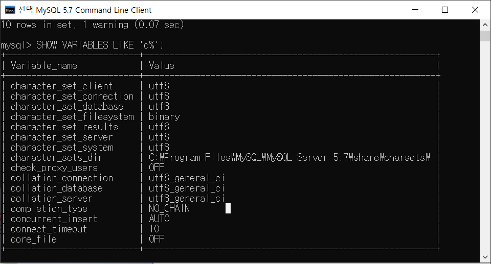 SHOW VARIABLES LIKE 'c%'; +--------------------------+---------------------------------------------------------+ | Variable_name | Value | +--------------------------+---------------------------------------------------------+ | character_set_client | utf8 | | character_set_connection | utf8 | | character_set_database | utf8 | | character_set_filesystem | binary | | character_set_results | utf8 | | character_set_server | utf8 | | character_set_system | utf8 | | character_sets_dir | C:\Program Files\MySQL\MySQL Server 5.7\share\charsets\ | | check_proxy_users | OFF | | collation_connection | utf8_general_ci | | collation_database | utf8_general_ci | | collation_server | utf8_general_ci | | completion_type | NO_CHAIN | | concurrent_insert | AUTO | | connect_timeout | 10 | | core_file | OFF | +--------------------------+---------------------------------------------------------+ 16 rows in set, 1 warning (0.01 sec)